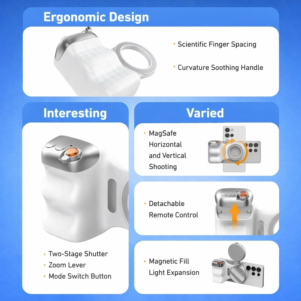 ShutterMag Pro gives your phone a true camera feel with a secure, ergonomic grip that instantly improves control. The strong magnetic hold keeps it locked in place, while the detachable remote shutter lets you capture shots effortlessly. Sharper photos, smoother videos, zero hassle.